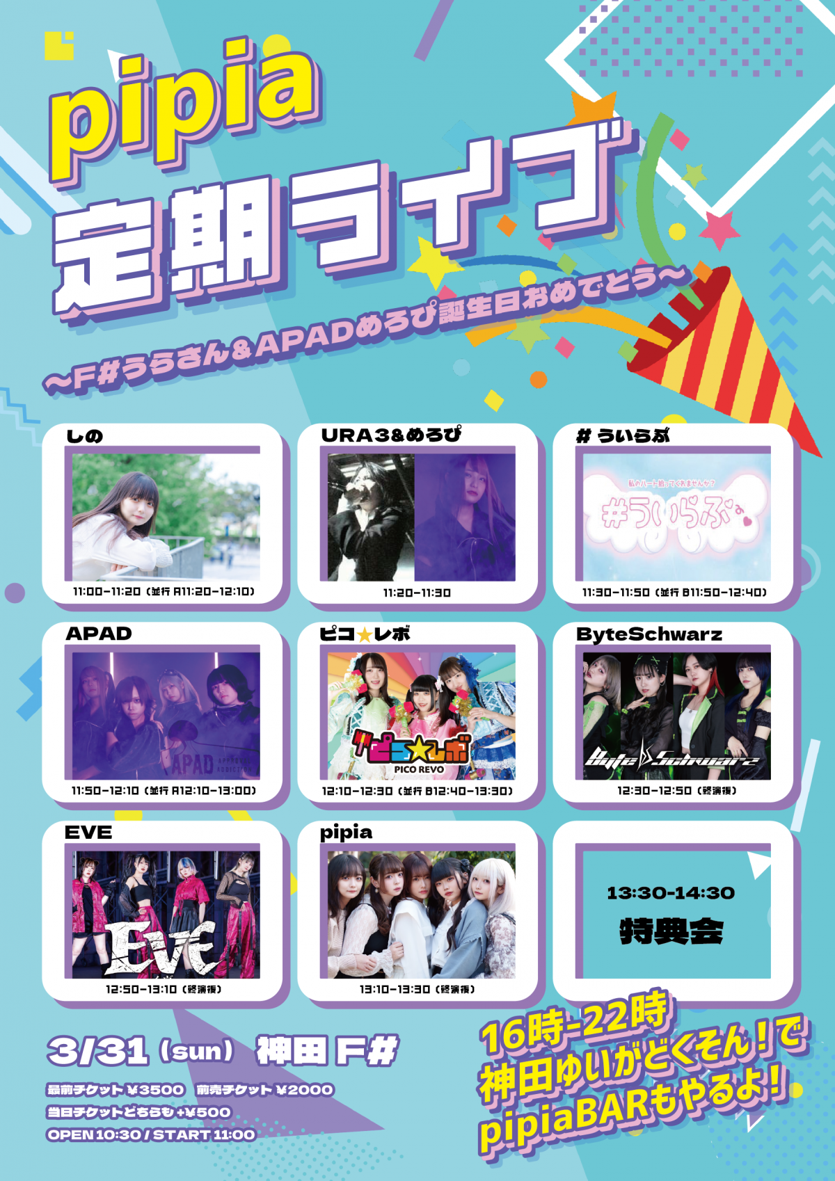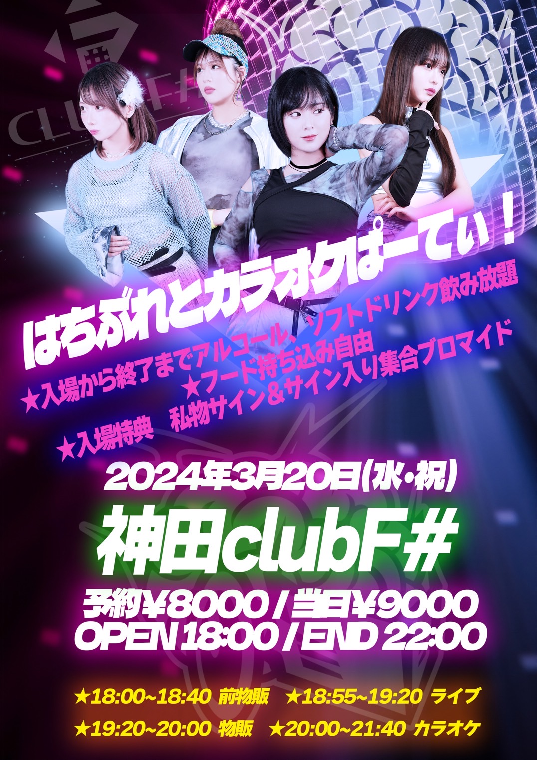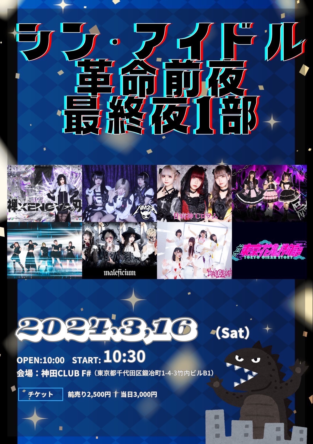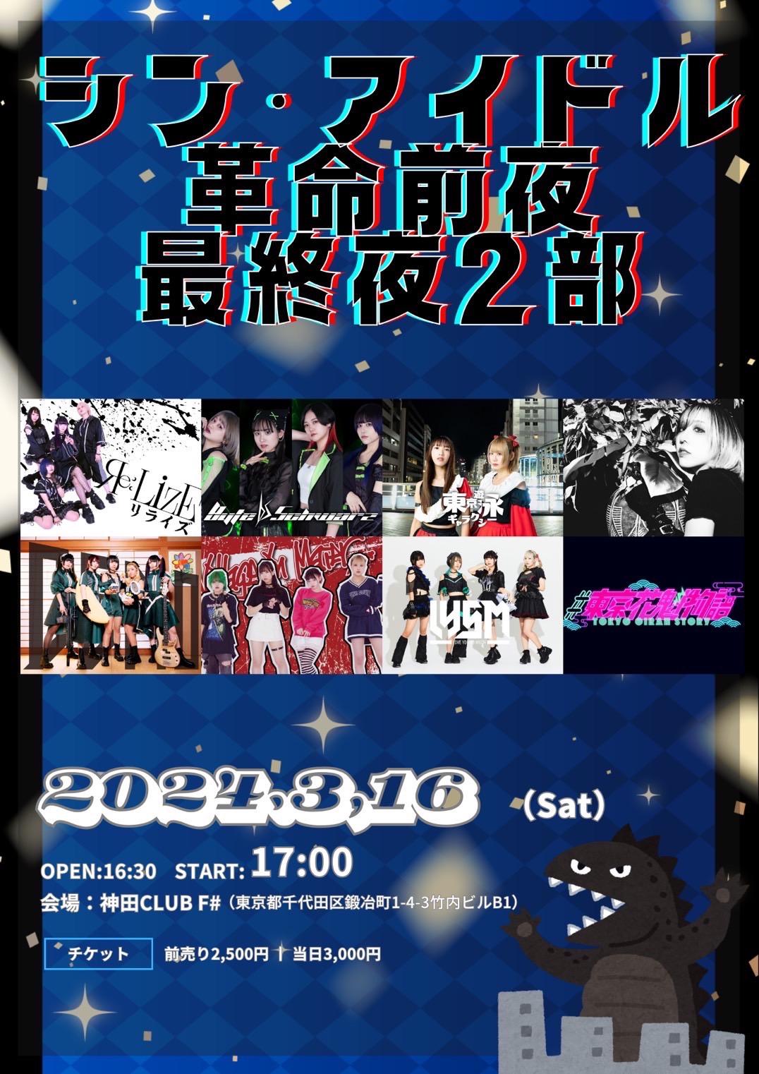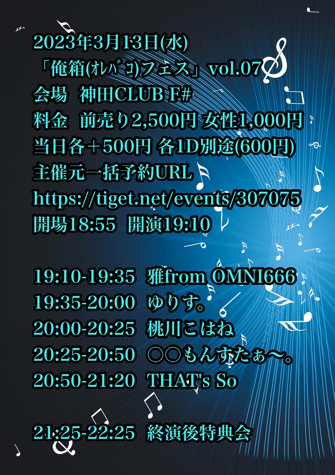 - 前売2500円,女性1000円,当日3000円,(1D600円別)