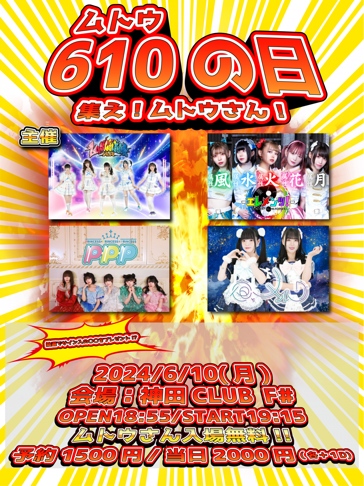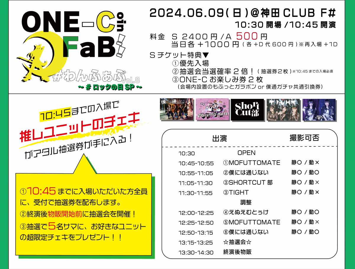 - Vチケ1,400円(最前エリア) , 一般0円, 当日+500円,(1D600円別)