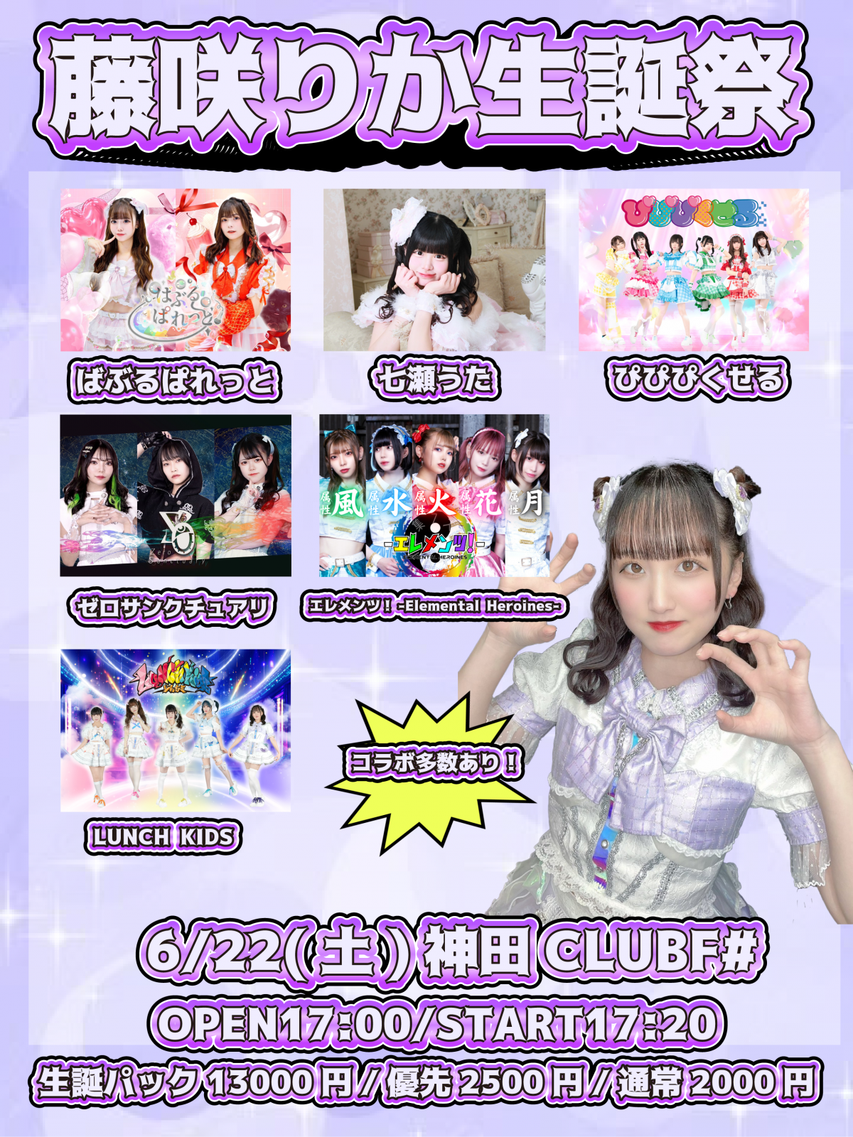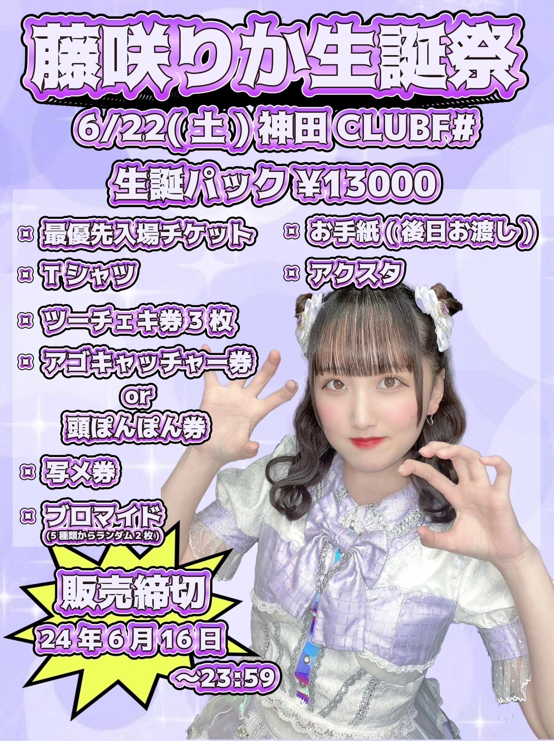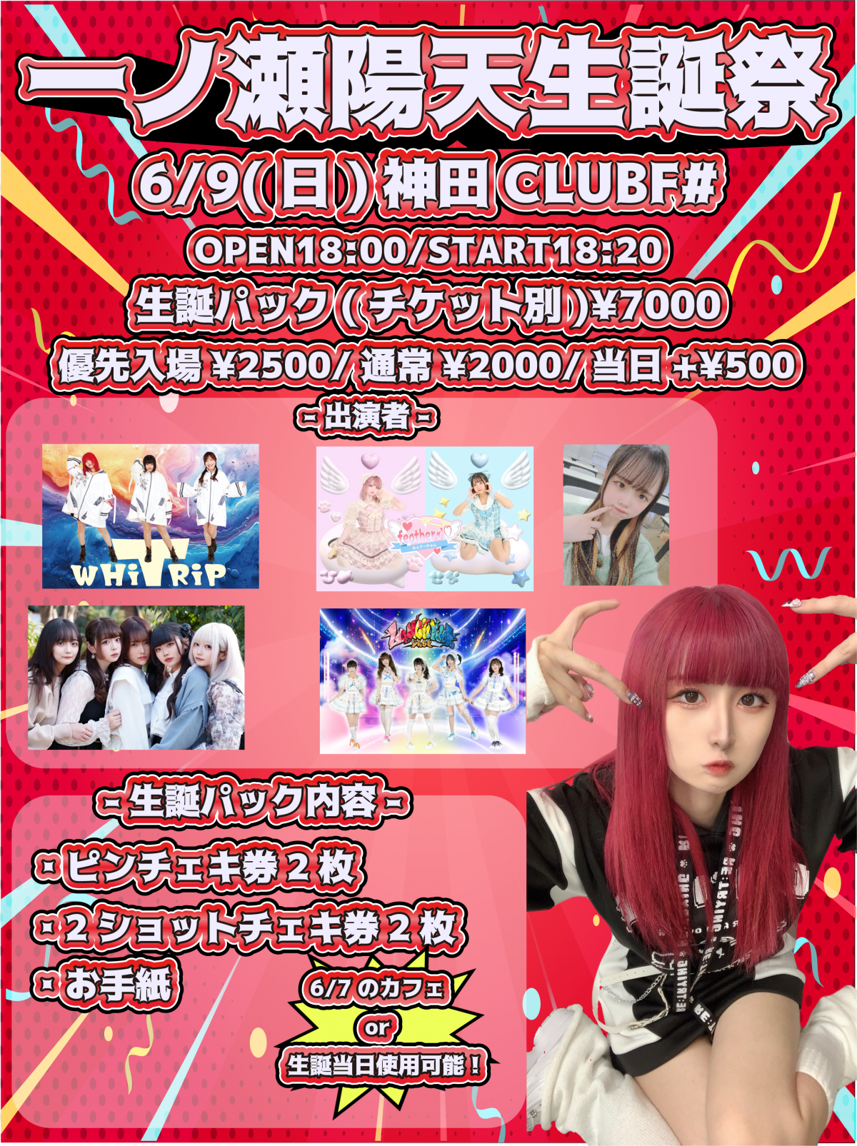 - 生誕パック13000円,優先2500円,通常2000円,当日+500円,(1D600円別)