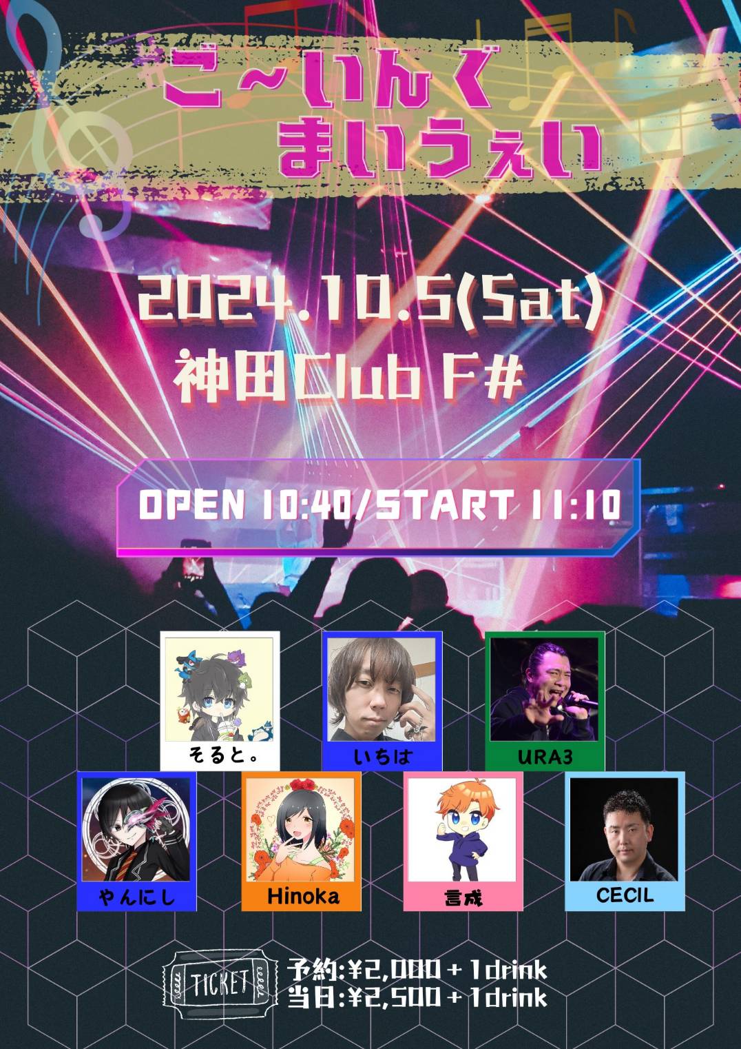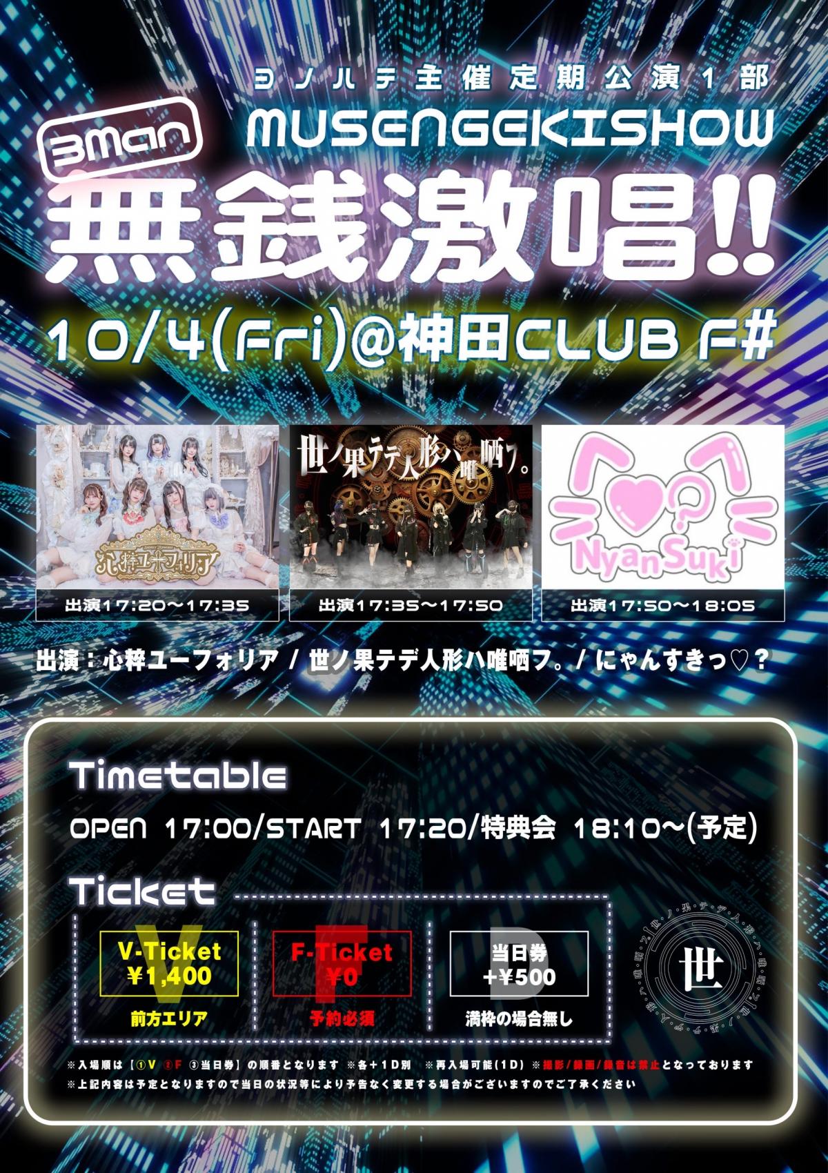 - Vチケ1,400円(最前エリア) , 一般0円, 当日+500円,(1D600円別)