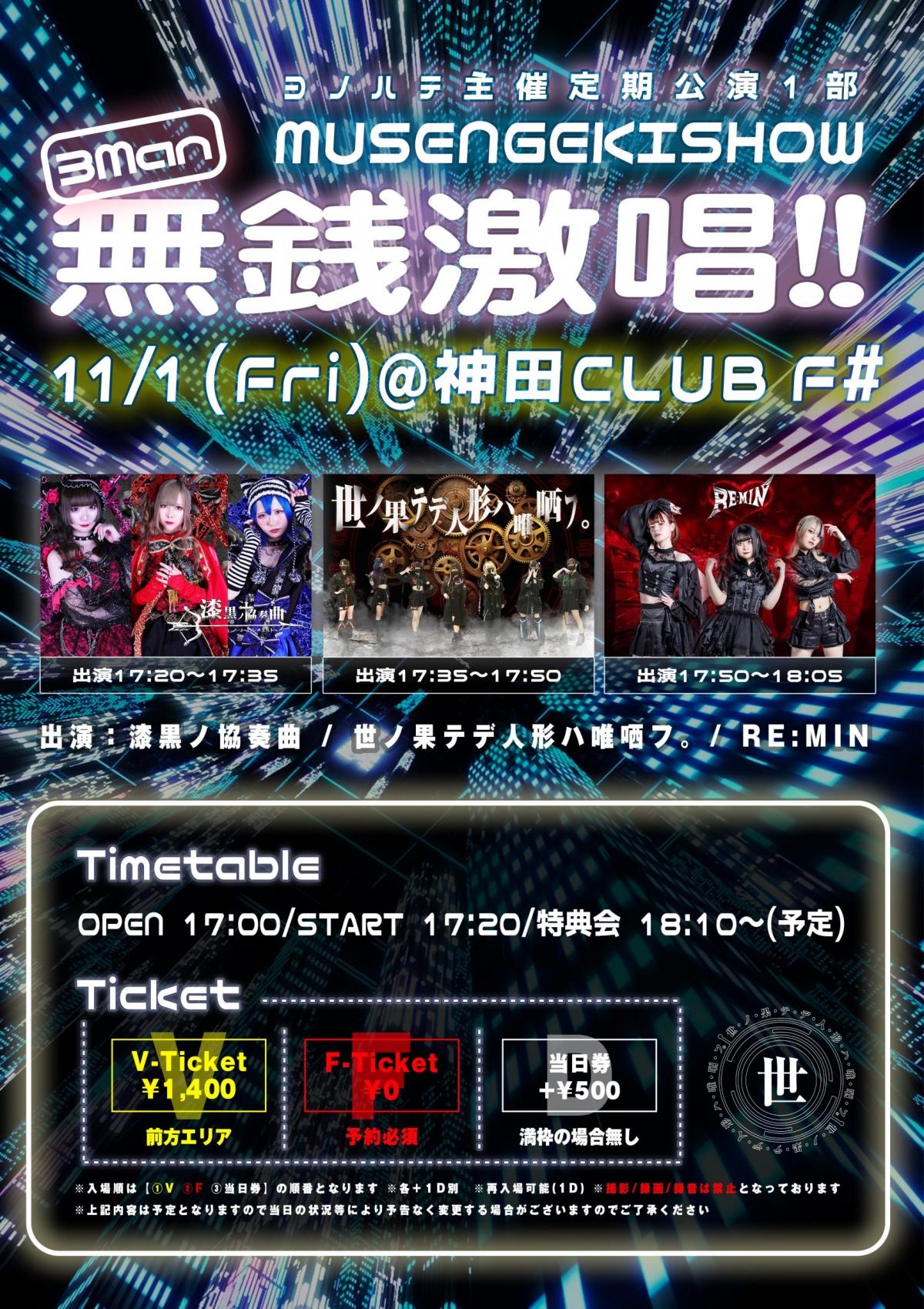 - Vチケ1,400円(最前エリア) , 一般0円, 当日+500円,(1D600円別)